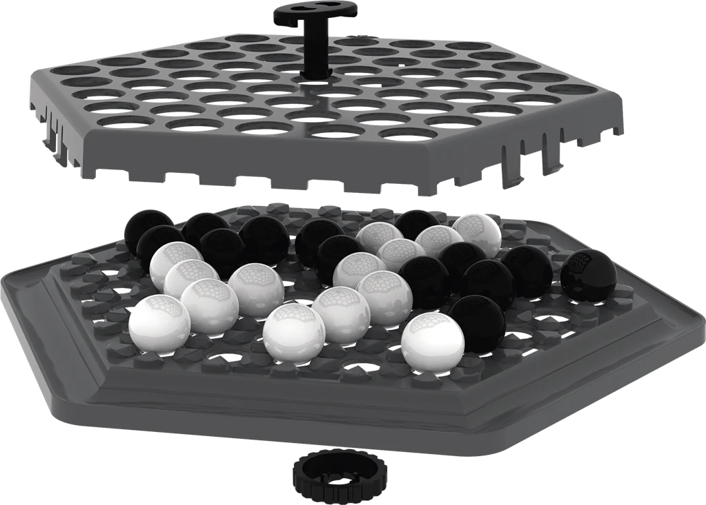 Éjectez six billes de votre adversaire du plateau hexagonal pour remporter la partie. Déplacez vos billes par une ou par ligne de 2 ou 3. Si vous êtes en surnombre, poussez les billes de votre adversaire ! Un classique indémodable vendu à des millions d’exemplaires dans le monde. L’objet indispensable de votre salon.