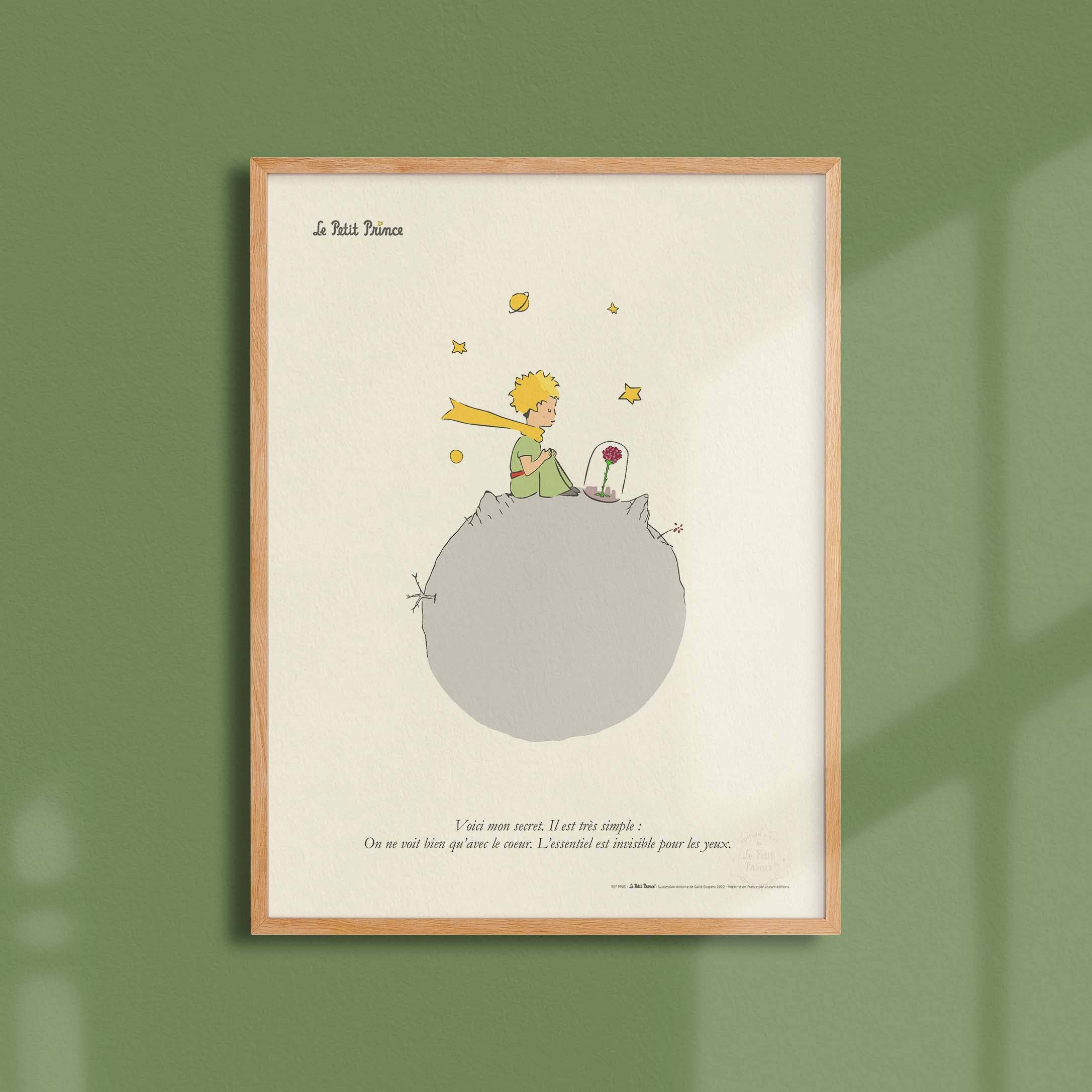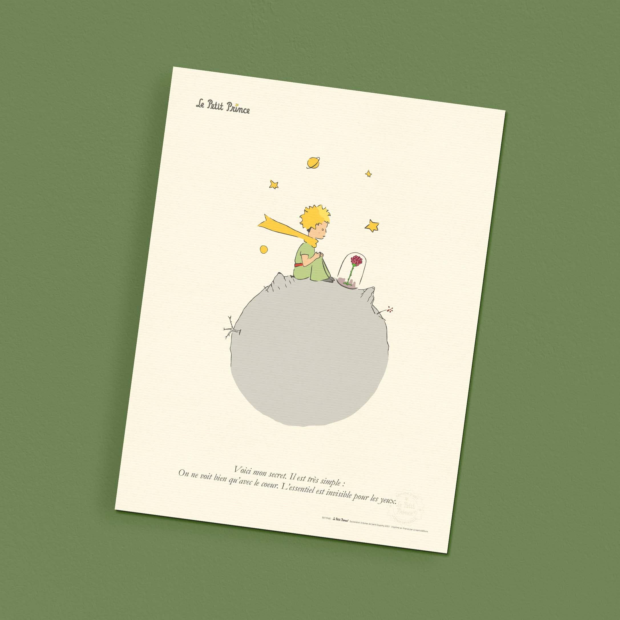 Cette illustration délicate s’accompagne de la célèbre citation : “Voici mon secret. Il est très simple : On ne voit bien qu’avec le cœur. L’essentiel est invisible pour les yeux.” Cette affiche officielle est éditée sous licence Le Petit Prince®. Il s’agit d’une reproduction d’une illustration de l’oeuvre d’Antoine de Saint-Exupéry. Chaque affiche comporte en bas à droite un tampon à sec attestant de son authenticité. Le Petit Prince®