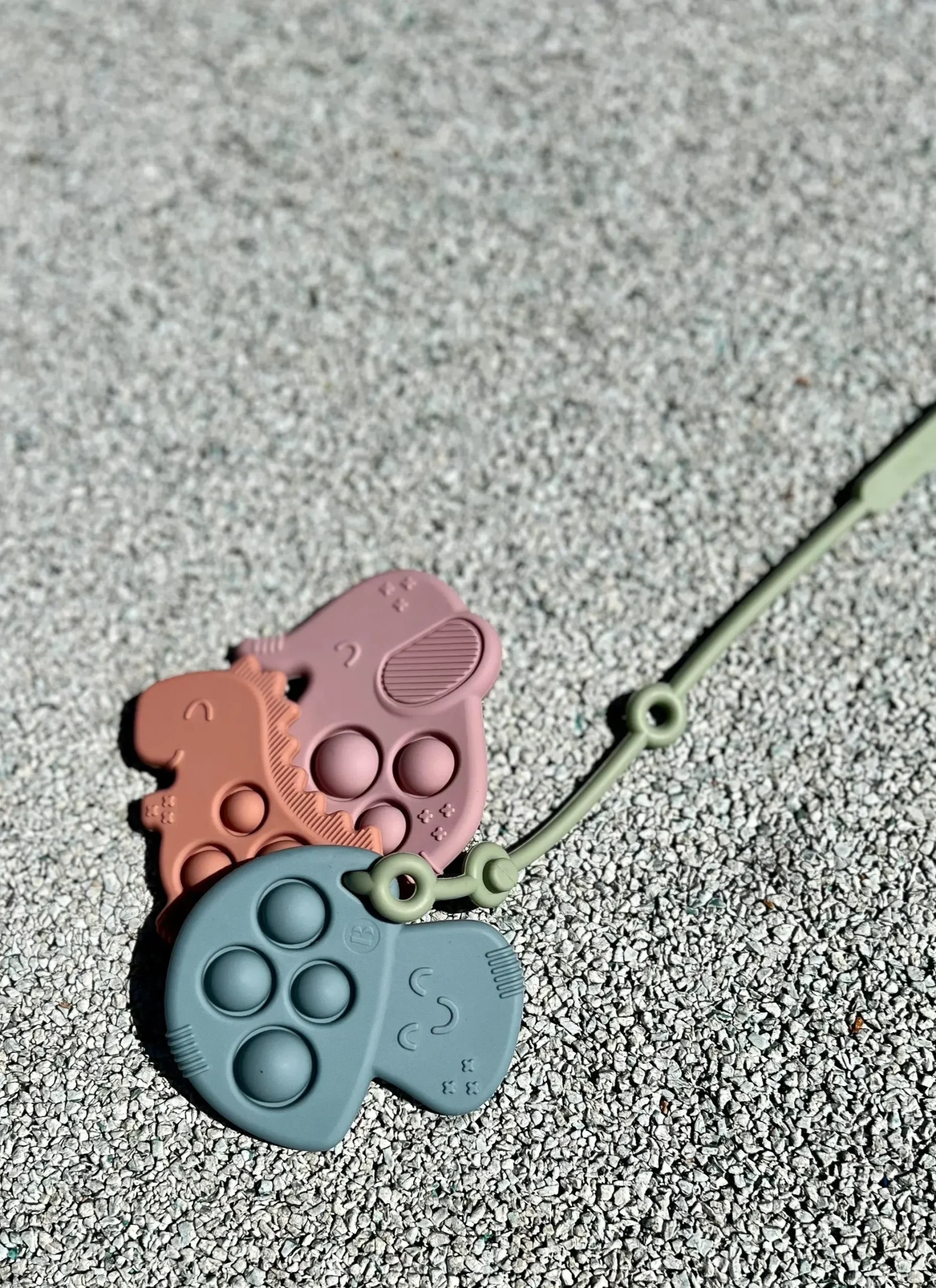 Sur la photo, notre anneau de dentition Pop-It est accompagné de notre Lovie Link® Vert, idéale pour garder le jouet à portée de main lors de déplacements.