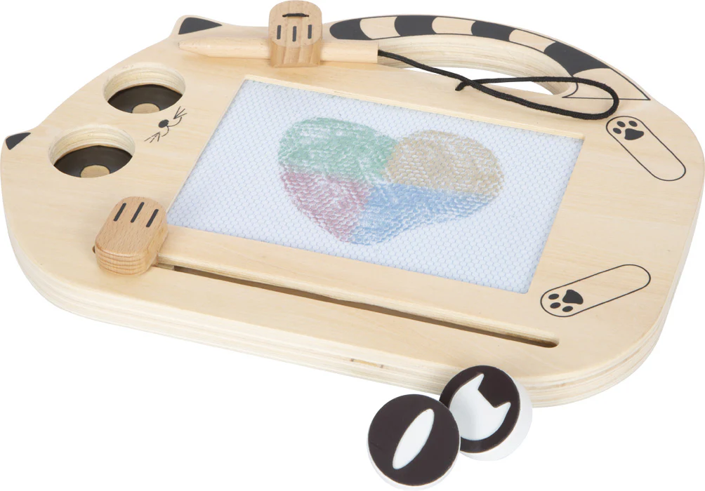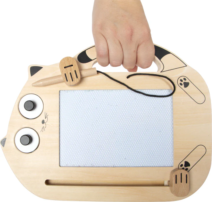 Cet adorable tableau à dessin en forme de chat est parfait pour les enfants qui aiment peindre et dessiner. Le crayon, solidement fixé à un ruban, permet de créer sans cesse de nouveaux dessins. Deux tampons avec des motifs d’œil de chat et de tête de chat, offrent des possibilités supplémentaires pour créer des œuvres d’art uniques. Particulièrement pratique : le crayon s’attache en toute sécurité sous la patte du chat lorsqu’il n’est pas utilisé et ne se perd pas grâce à la fixation. Lorsque le chef-d’œuvre est terminé ou que l’on veut faire de la place pour de nouvelles idées, il suffit d’effacer le tableau à l’aide de la languette coulissante – tout est ainsi prêt pour la prochaine œuvre d’art ! Tableau avec un dégradé de couleurs.