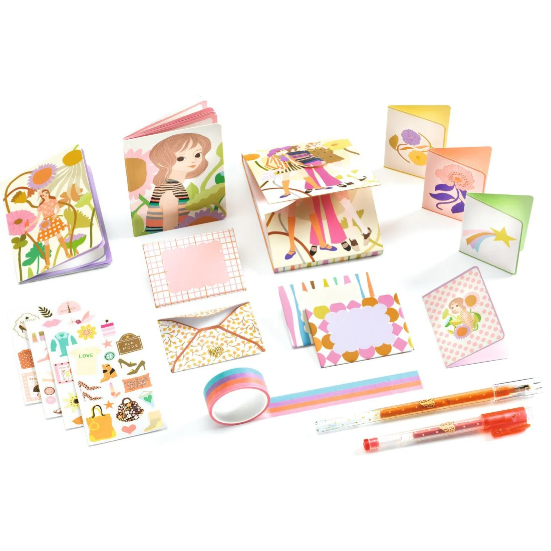 Contenu : 1 coffret armoire, 2 carnets, 1 bloc-notes, 4 cartes, 4 enveloppes, 1 masking tape, 4 planches de stickers, 2 stylos gel.