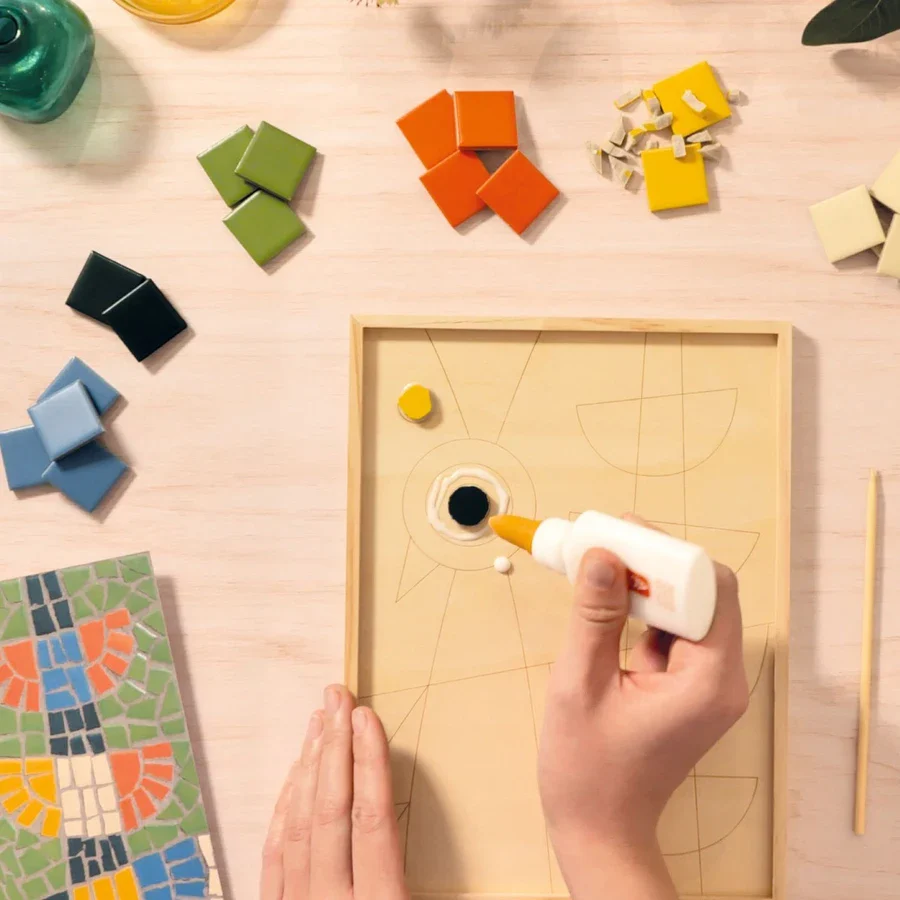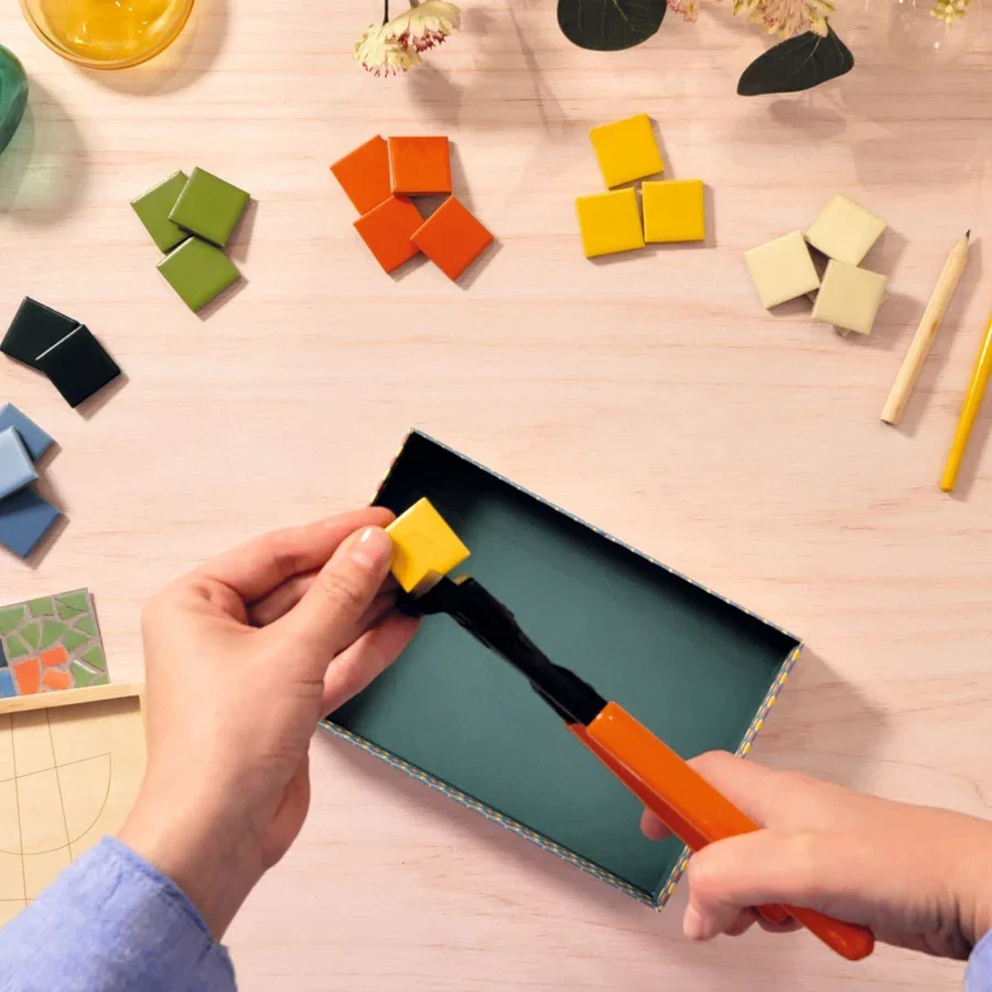 Ce coffret comprend 1 plaque de bois imprimée, 100 tesselles en céramique, 1 pince de mosaïste à couper les tesselles, 1 sachet de ciment, 1 spatule souple, 1 tube de colle, 1 modèle à suivre, un dépliant et une carte avec QR code menant à une vidéo tuto pour découvrir l’activité.
