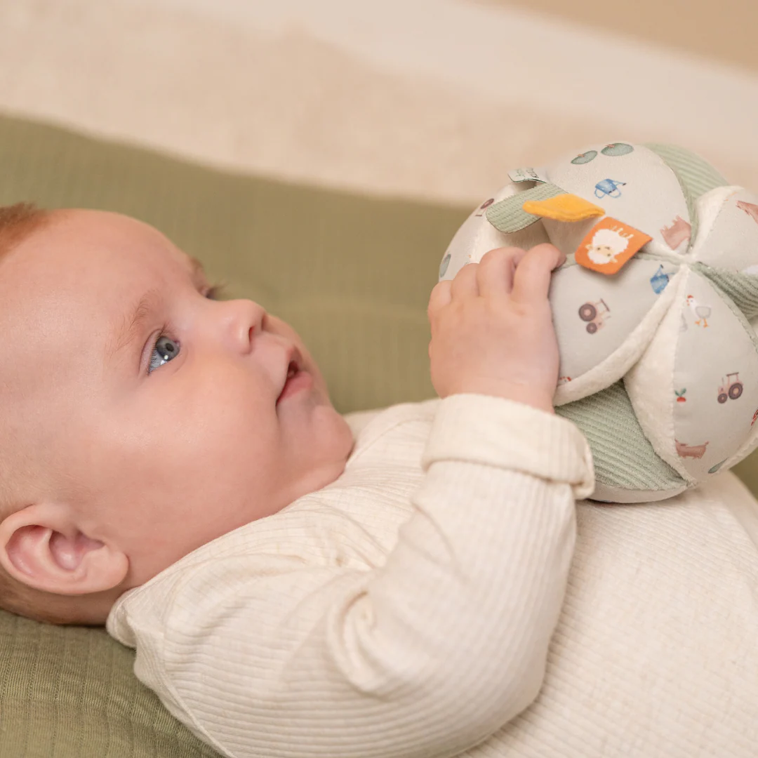 Découvrez cette balle de préhension captivante pour votre bébé. Sa forme intrigante constitue un défi stimulant. Les surfaces, ornées de textures et motifs variés, incitent à la saisie et à l’exploration. Facile à attraper pour les petites mains, elle récompense les efforts de votre bébé avec le son ludique d’une clochette. Arborant une adorable décoration Little Farm et des étiquettes amusantes, elle stimule les sens, favorise la prise en main et divertit votre bébé dans le parc. Offrez-lui une expérience sensorielle enrichissante et encouragez son développement moteur avec cette balle captivante.