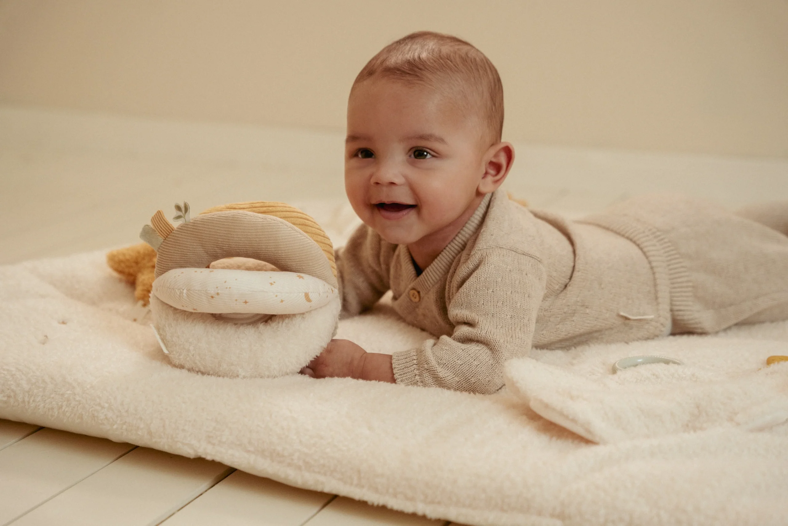 Petites mains, grandes aventures ! La balle à saisir est spécialement conçue pour les bébés curieux et désireux d’explorer le monde. Son tissu doux, ses couleurs subtiles et sa forme ludique permettent de l’attraper, de la faire rouler et de la découvrir. Elle stimule le développement de la motricité et procure des moments de jeu sans fin. Les différentes textures invitent les petits doigts à sentir et à saisir, ce qui est parfait pour les petites mains. Un merveilleux premier jouet à tenir, à jouer et à garder toujours à portée de main.