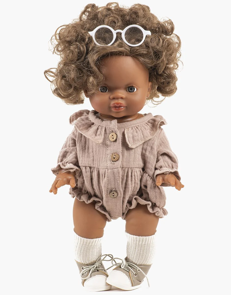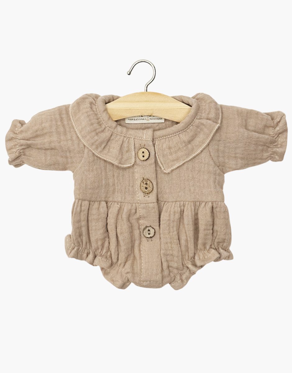 Barboteuse Léonore à manches longues en gaze de coton moka Barboteuse Léonore à manches longues en gaze de coton pour poupées Minikane Gordis 34 & 37cm. Design, développement & confection MADE IN FRANCE Vendu seul sans poupée