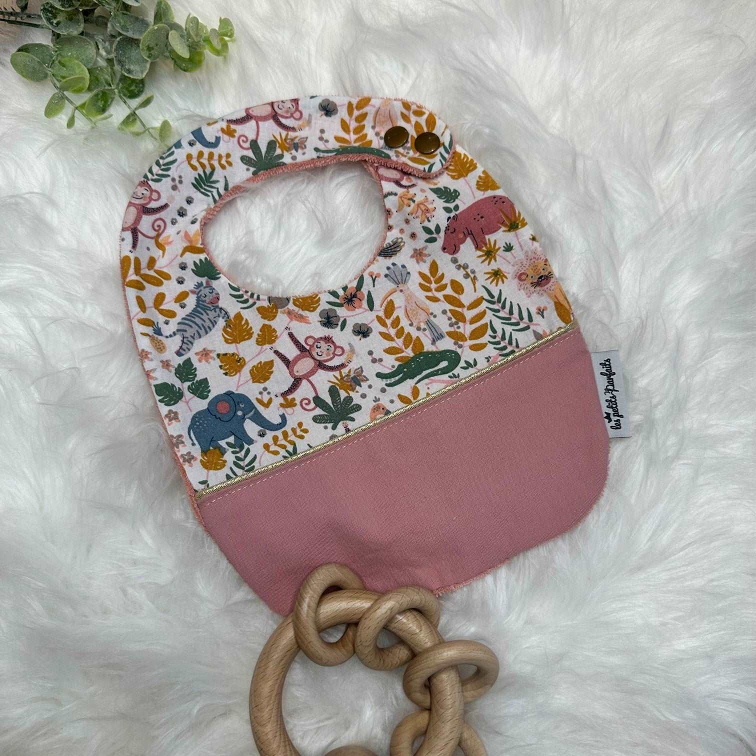 Le bavoir est doté d’une face en micro-éponge rose 100% coton bio et se ferme grâce à un bouton pression (double position) qui permet de s’adapter au cou de bébé.