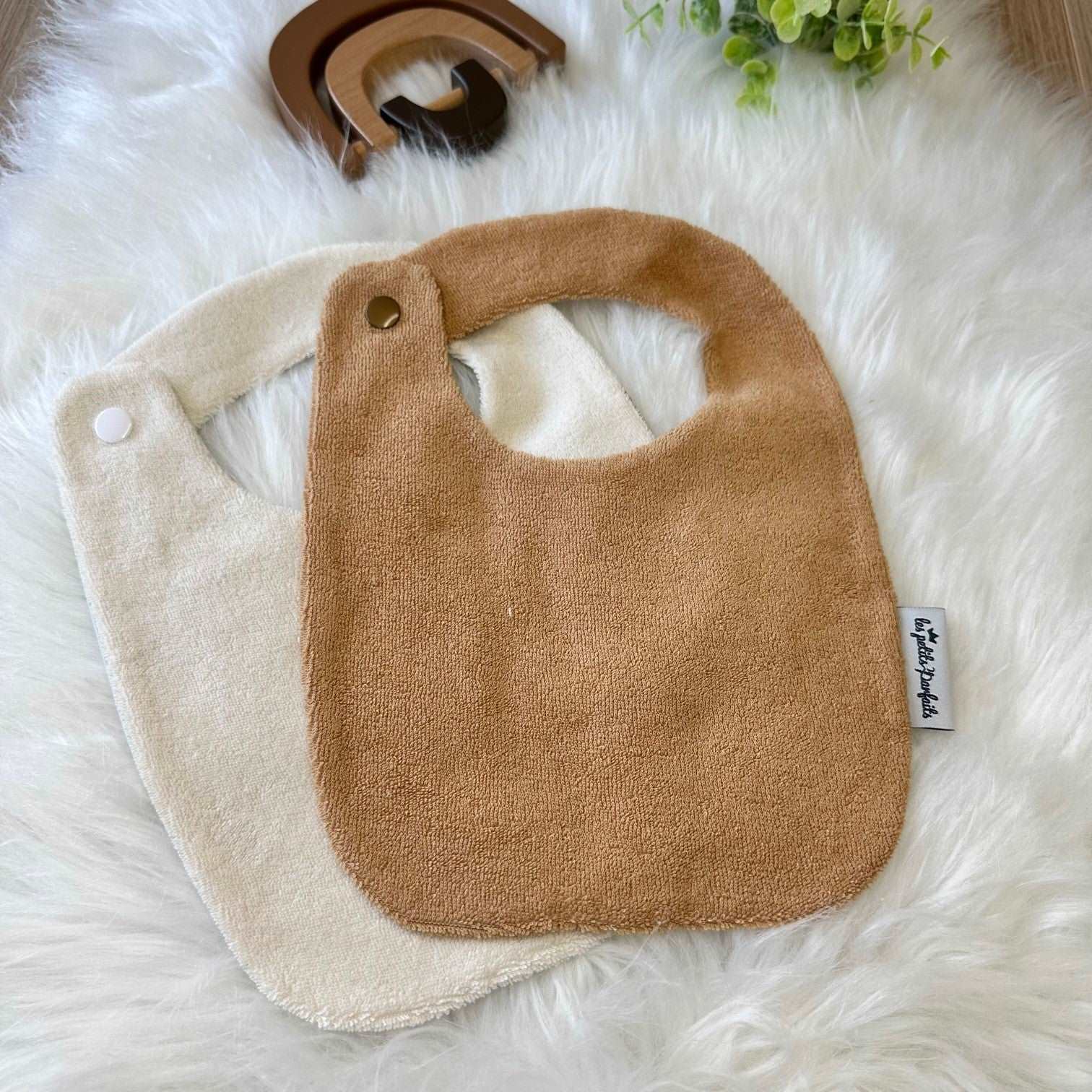 Lot composé de 2 bavoirs pressions bébé assortis avec une micro-éponge 100% coton biologique :