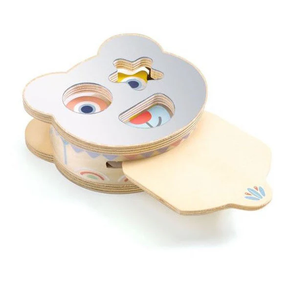 Cette boite à formes original possède un miroir qui permettra à votre enfant d’observer son reflet. Quelle surprise d’observer chaque pièce se dédoubler par le reflet du miroir! L’enfant glisse les 3 pièces géométriques dans les trous correspondants pour former le visage de l’ours. Il tire ensuite sur la languette et les formes disparaissent.