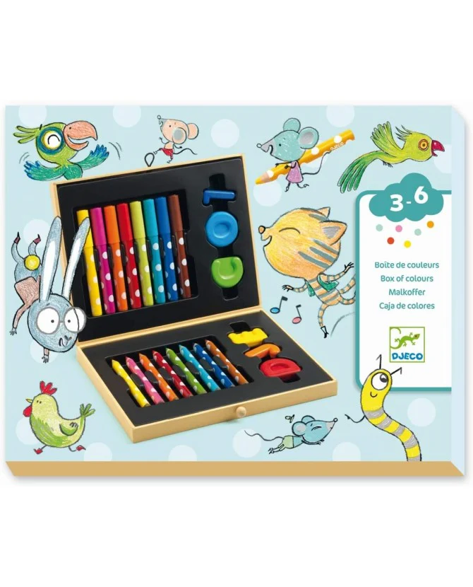 La mallette de dessin contient 8 crayons de couleurs ergonomiques, 8 feutres à grosses pointes lavables et 6 crayons de cire sculptés.