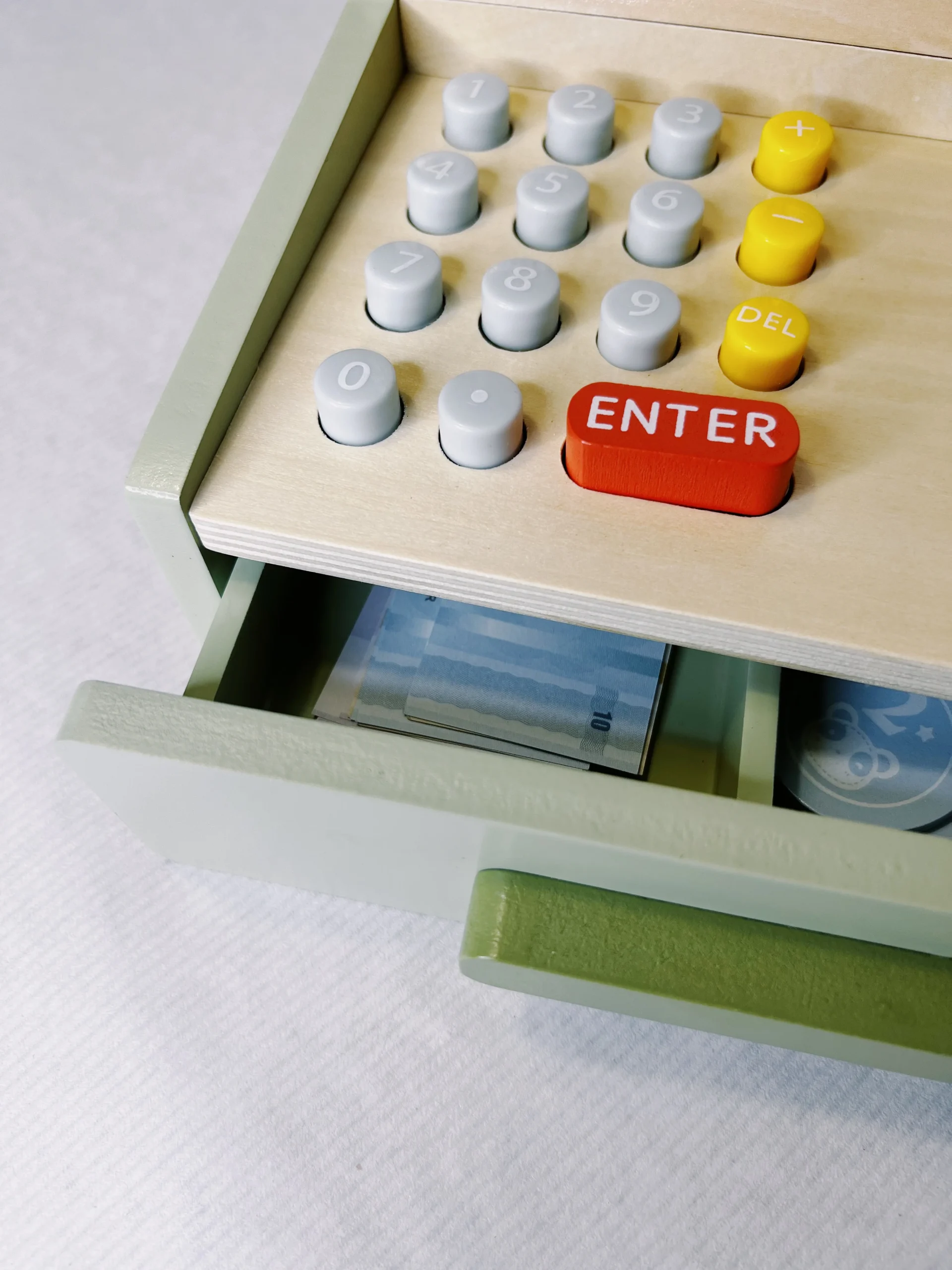 Caisse enregistreuse en bois réaliste avec calculatrice fonctionnelle et tiroir-caisse Comprend des accessoires : argent factice, carte de crédit, lecteur de carte et cartes de produits Fabriqué en bois durable avec peintures non toxiques Favorise l’apprentissage du comptage, des transactions et de l’interaction sociale Parfait pour les enfants dès 3 ans et idéal comme cadeau