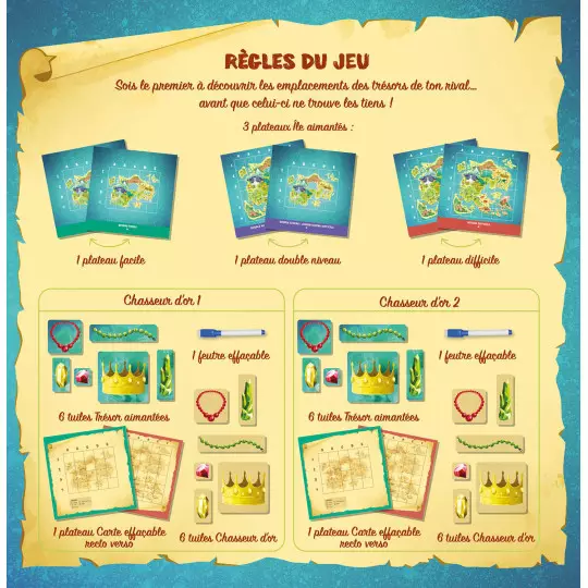 Contenu : 3 plateaux magnétiques, 2 plateaux effaçables, 12 tuiles magnétiques, 12 tuiles et 2 feutres effaçables. Un jeu stratégique et amusant qui ravira petits et grands aventuriers !