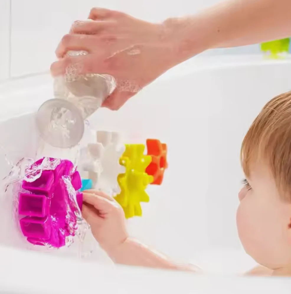 Collez les roues sur une surface lisse dans le bain. Utilisez une tasse ou vos mains pour verser de l’eau sur les roues et les regarder tourner ! Encouragez votre enfant à déplacer les roues et à expérimenter différentes combinaisons pour voir comment elles tournent ensemble.