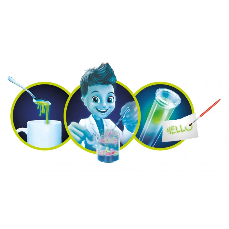 Un coffret pour réaliser 6 expériences qui brillent la nuit : lampe à lave fluo, encre visible, slime phosphorescent…