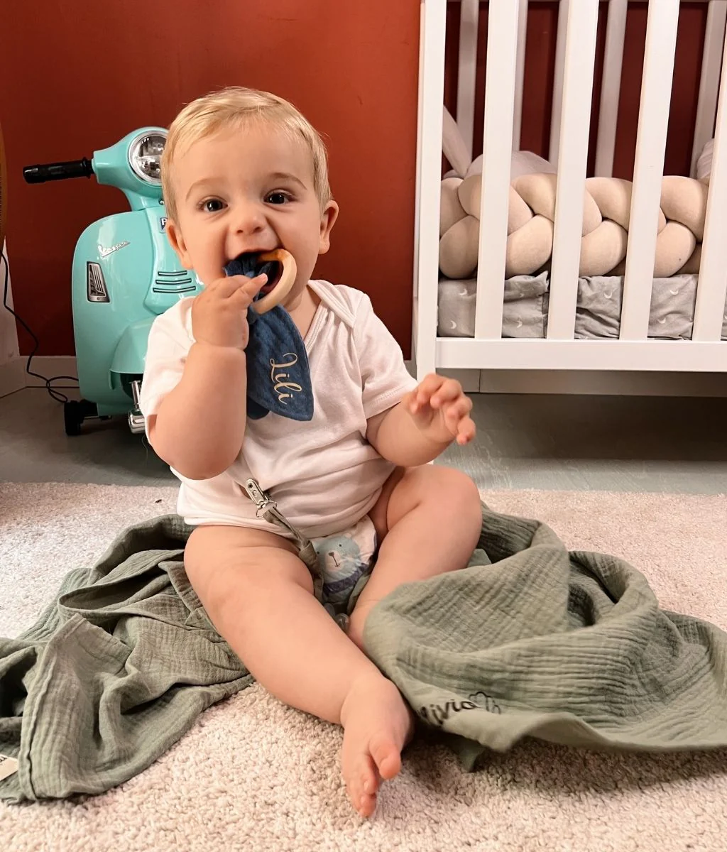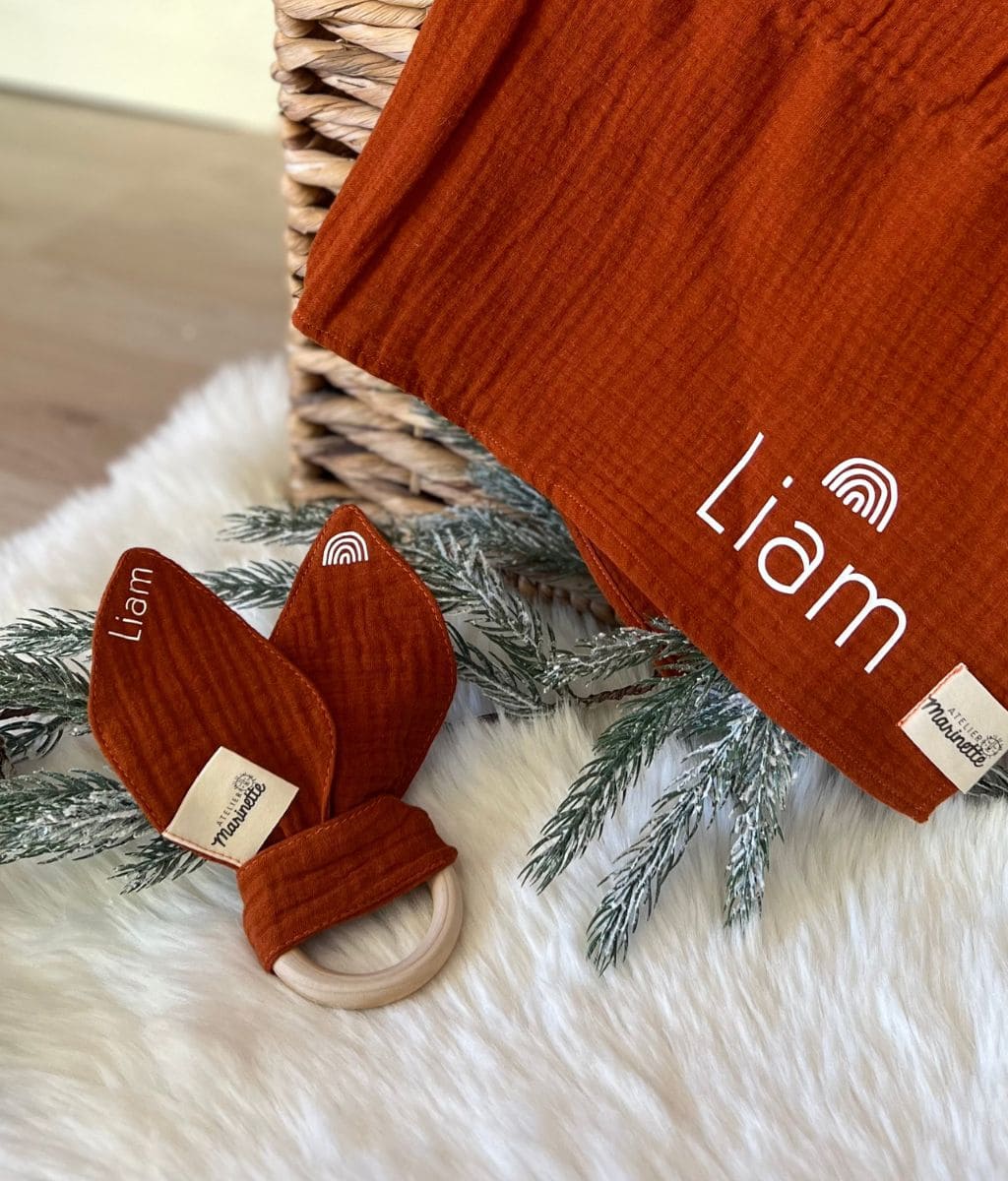 Idéal pour un petit cadeau de naissance personnalisable, Bébé appréciera beaucoup cet anneau de dentition pour ses oreilles de lapin en gaze de coton et son anneau en bois non traité à mordiller.