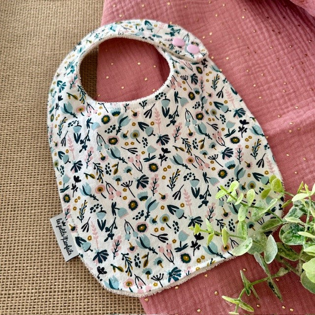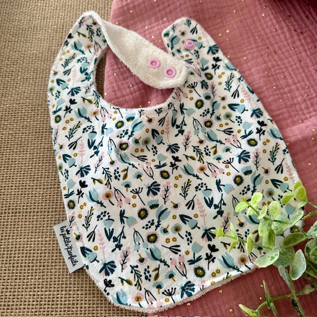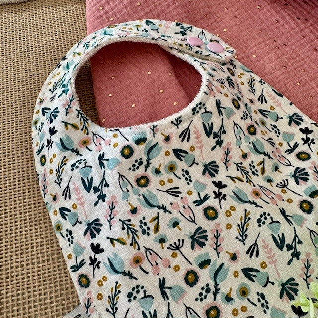 – un bavoir motifs fleurs vert paon, rose et bleu