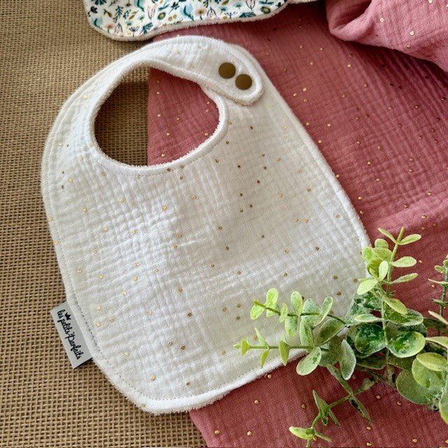 – un bavoir en double gaze blanc pois doré