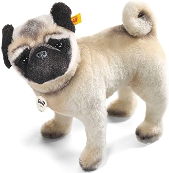 Ce petit chien est un véritable joyau. Il est fait d’alpaga de haute qualité, mesure 30 cm et possède une tête rotative. Le joli carlin a des yeux en plastique et un « bouton à l’oreille » plaqué laiton.