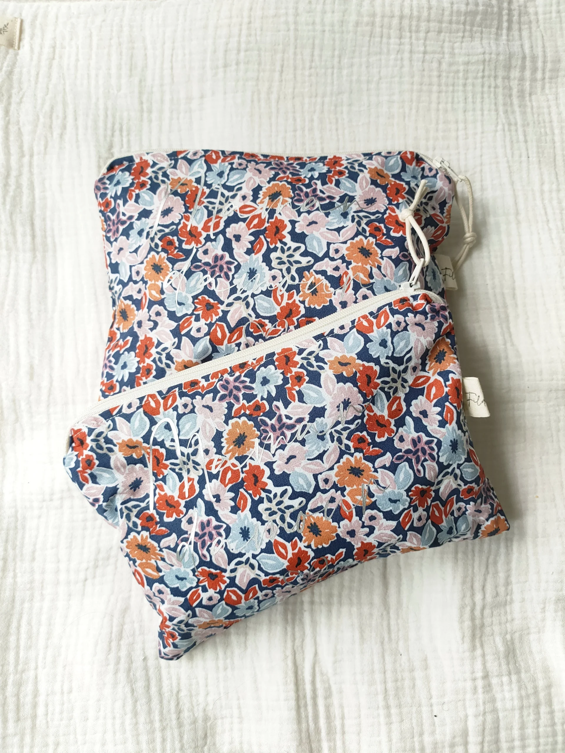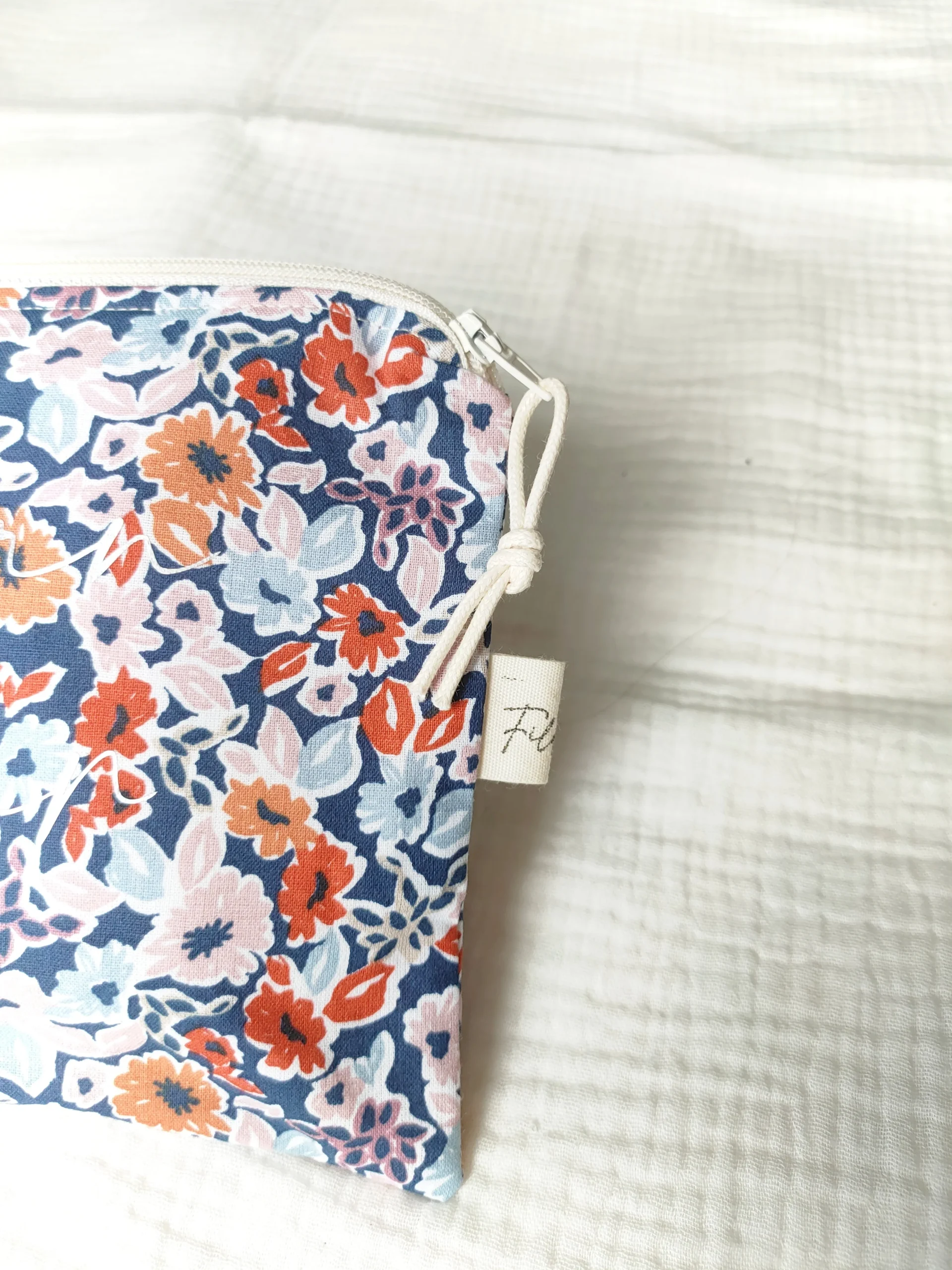 Le zip agrémenté d’un petit cordon apporte un côté nature et bohème à cette pochette du quotidien. Sachez que cette pochette a été confectionnée avec un tissu coton fleuri à l’extérieur et une doublure en coton bleu.