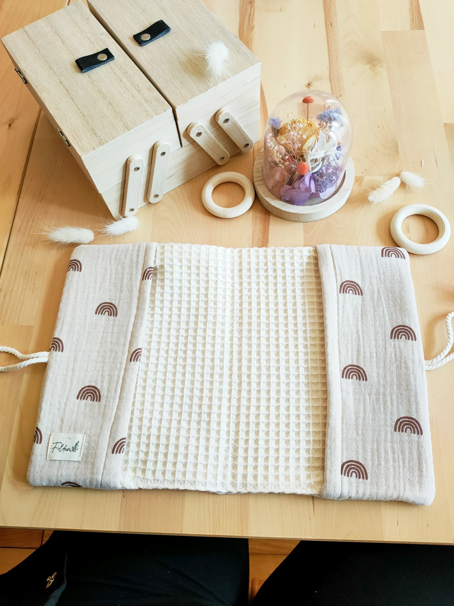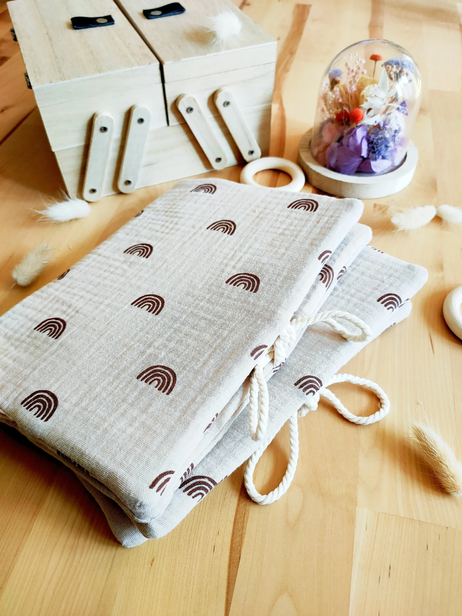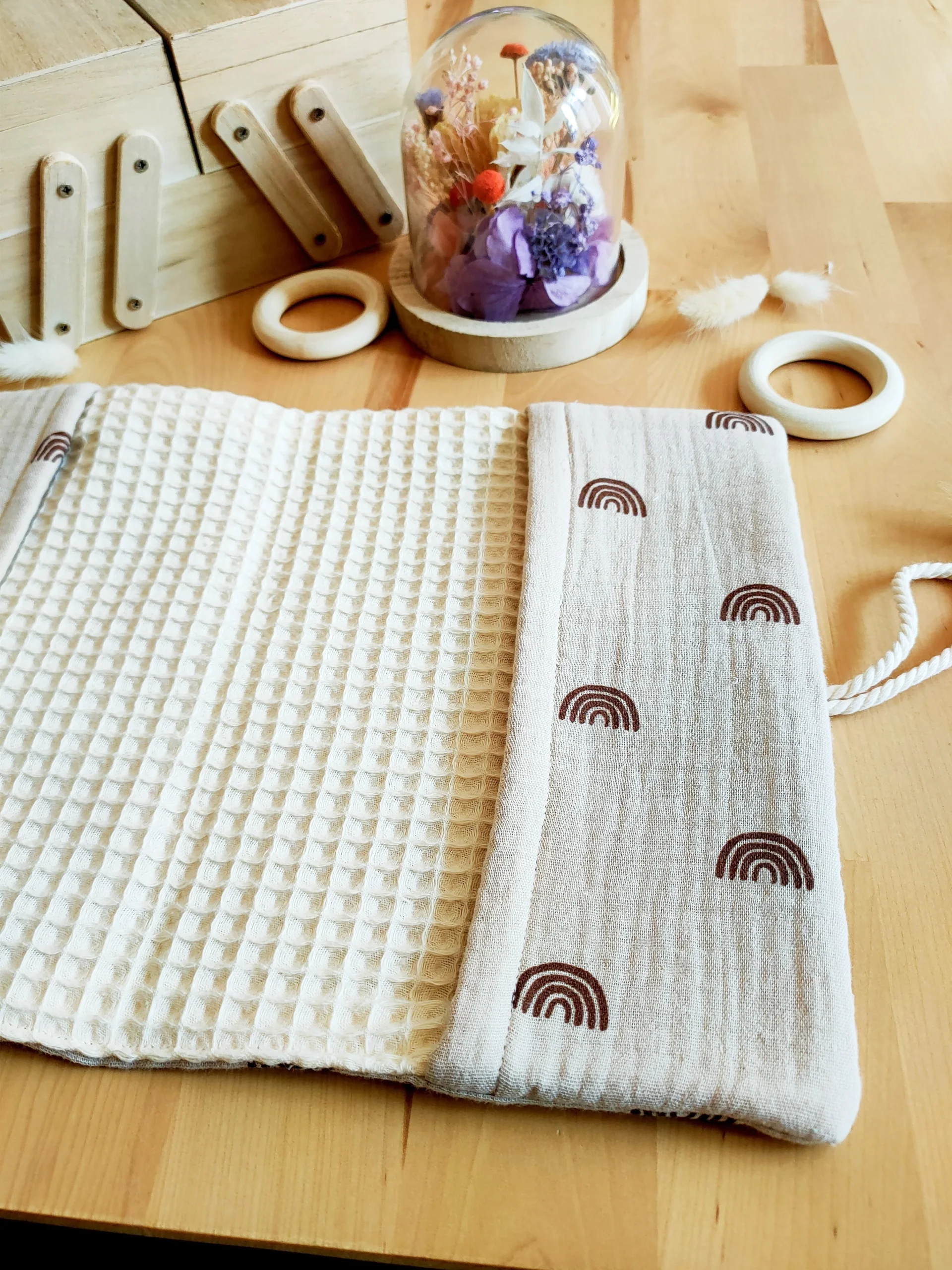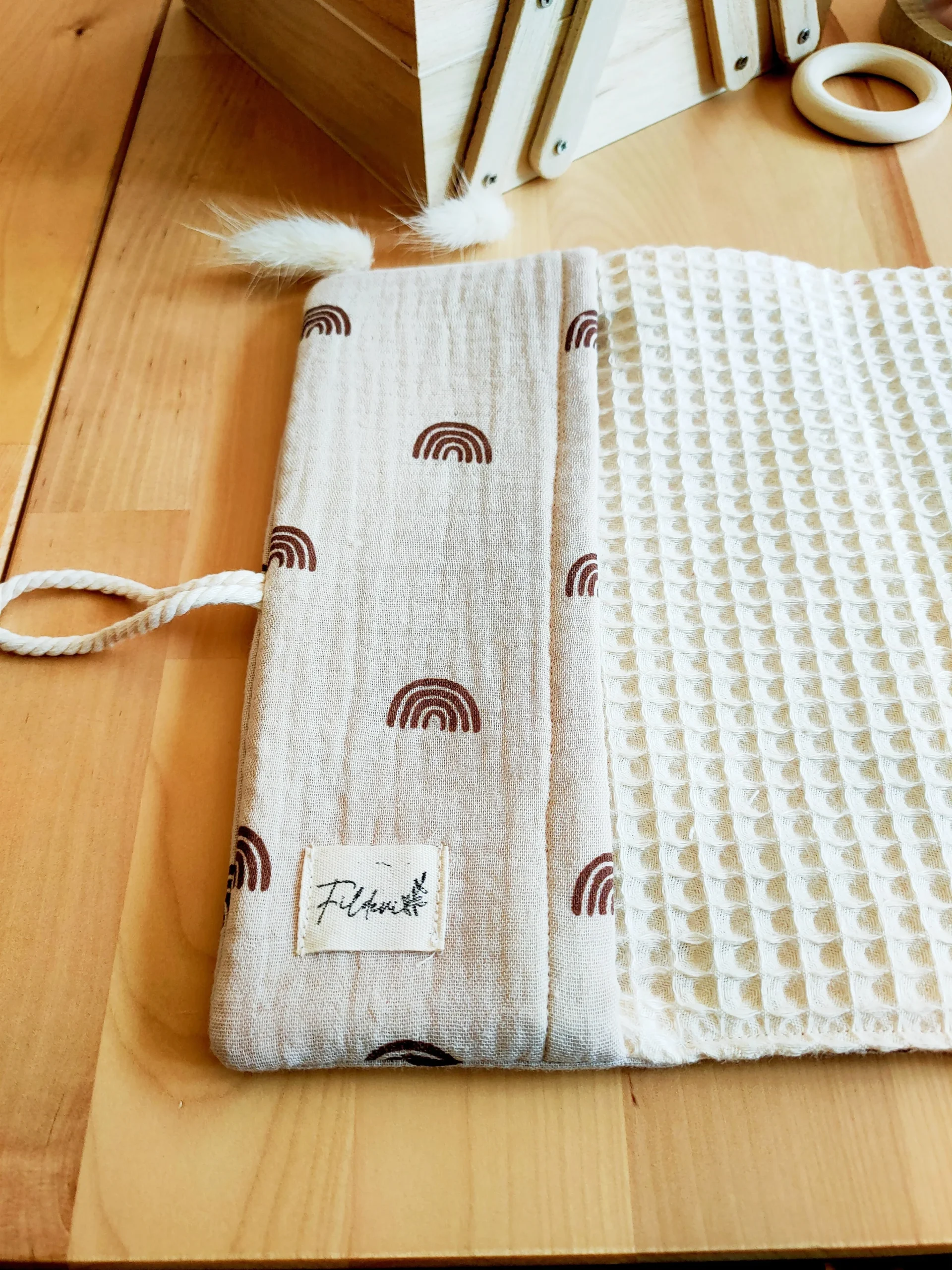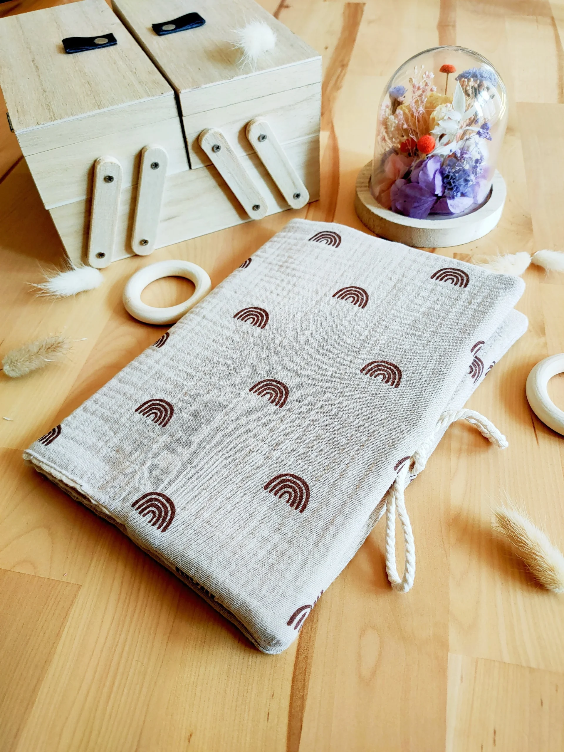 Découvrez ce protège carnet de santé fait main de couleur beige avec ces détails arc-en-ciel maronnés ! Un cadeau de naissance à la fois sobre et original.