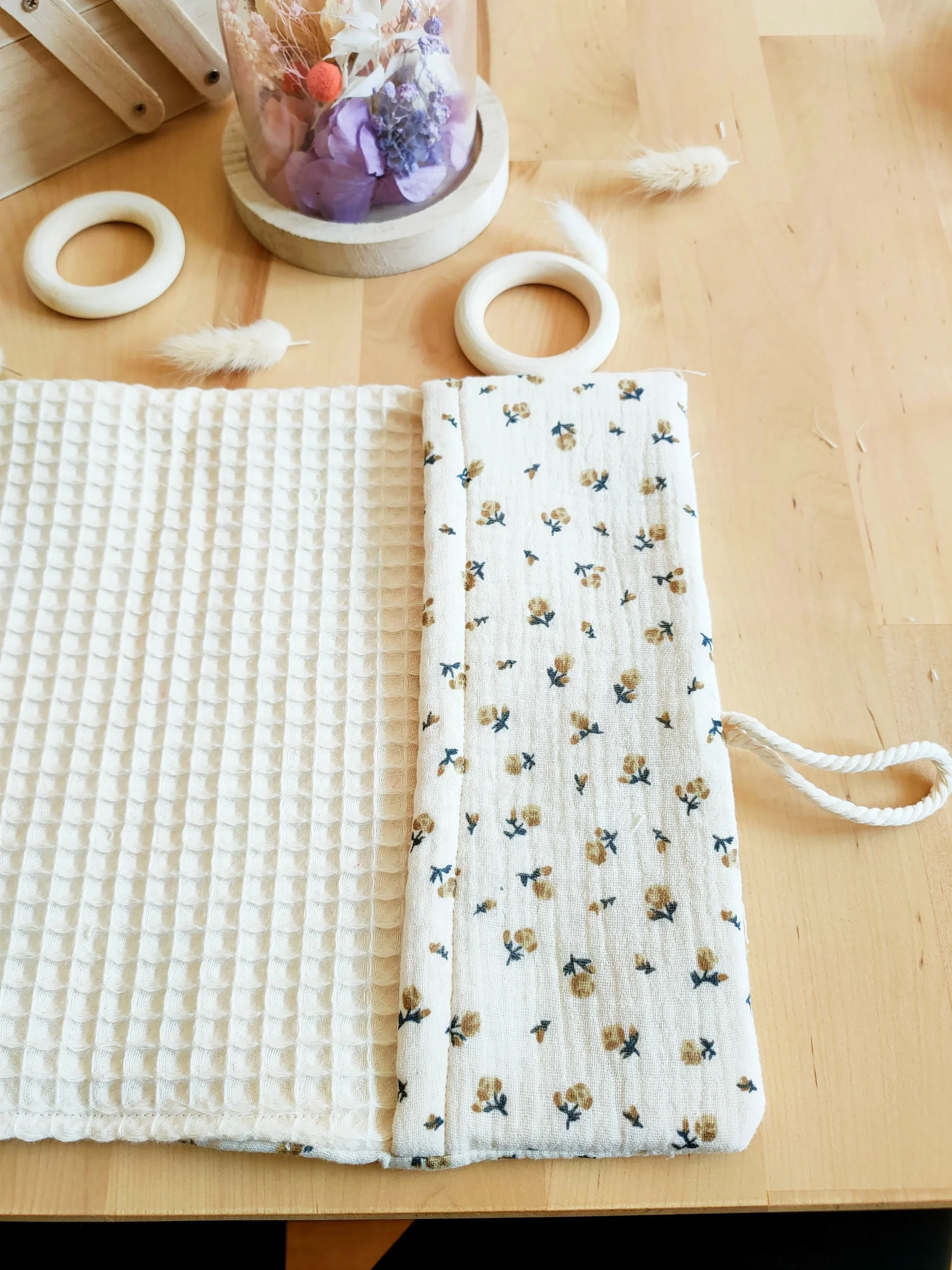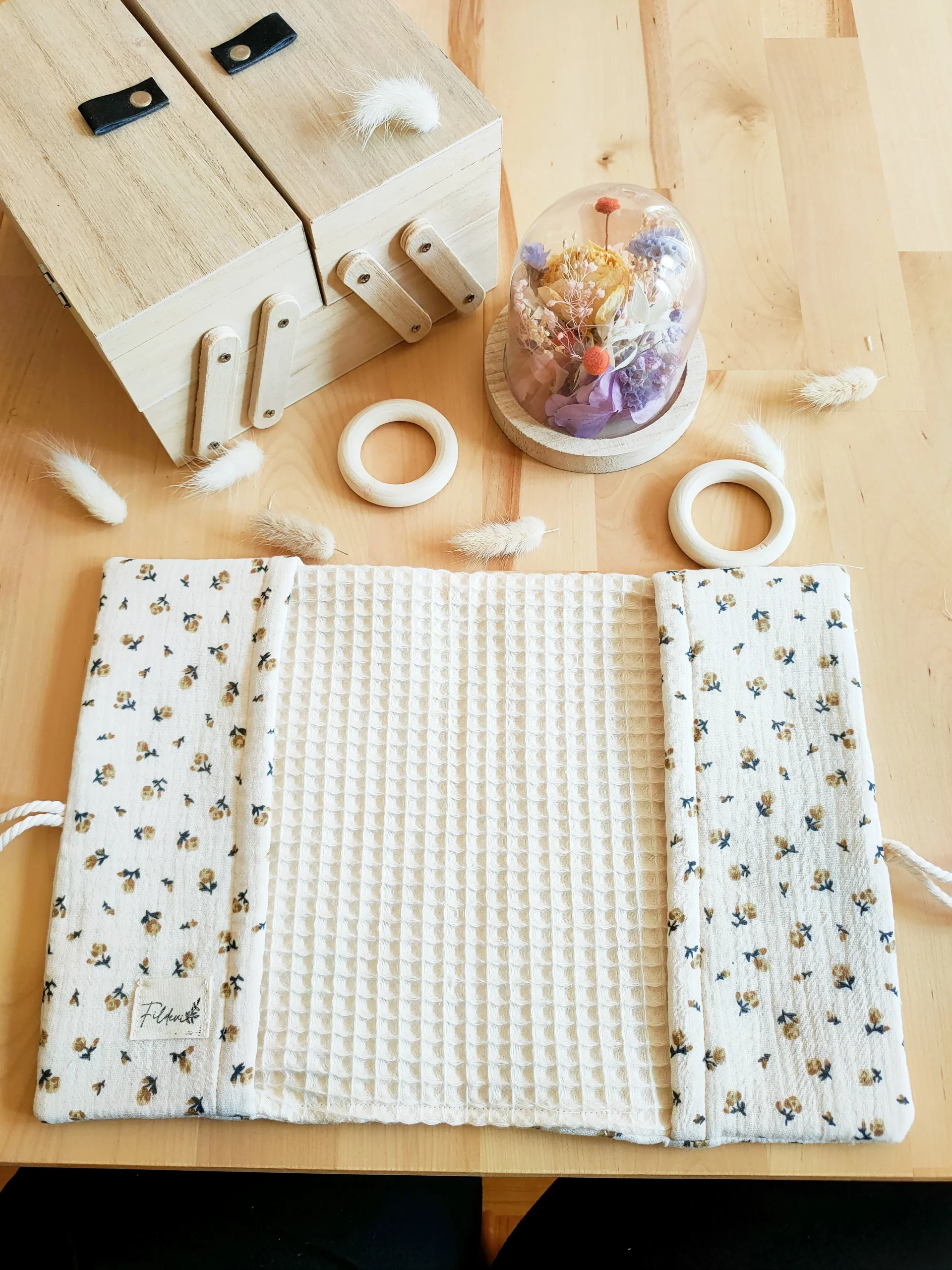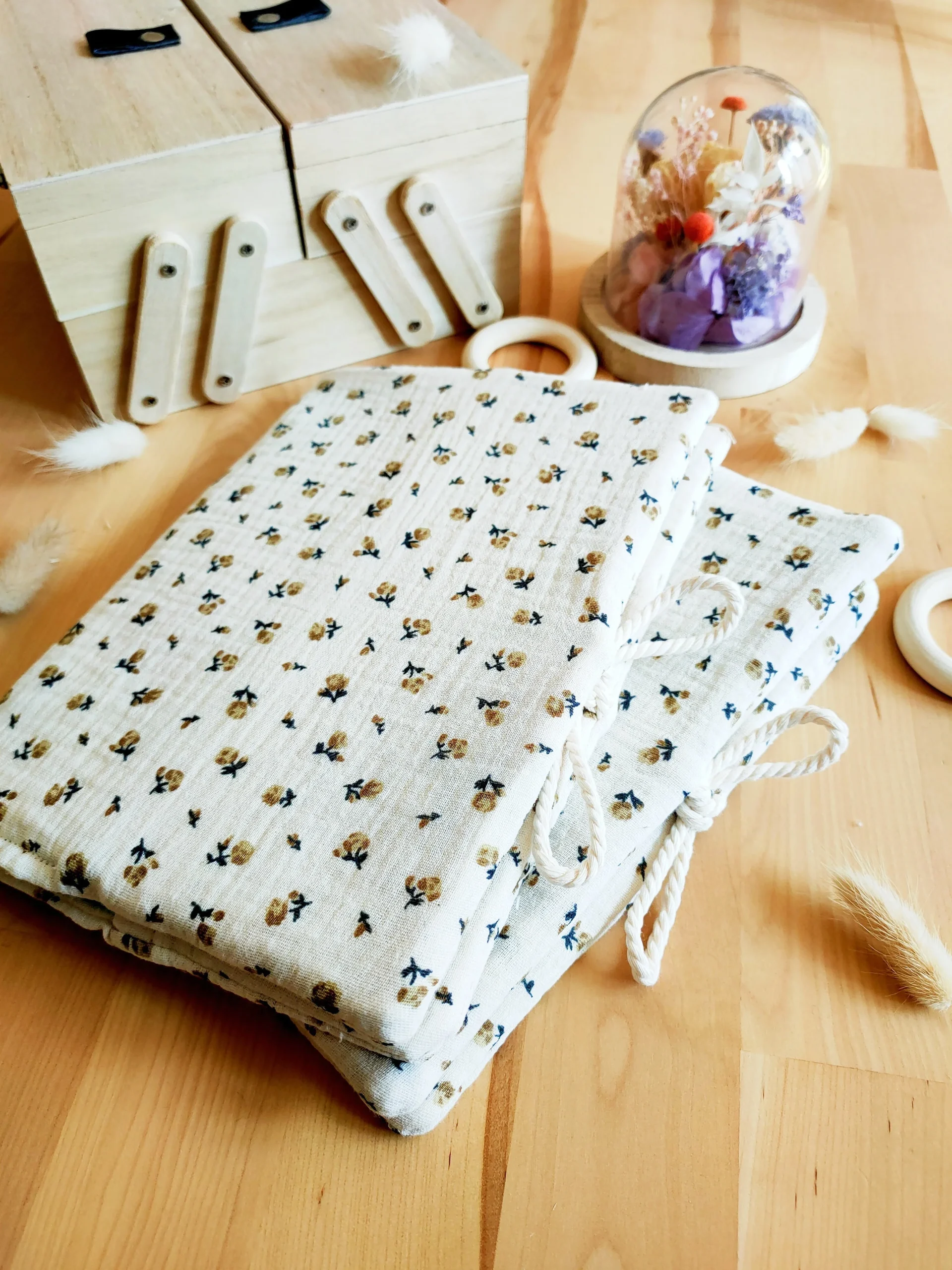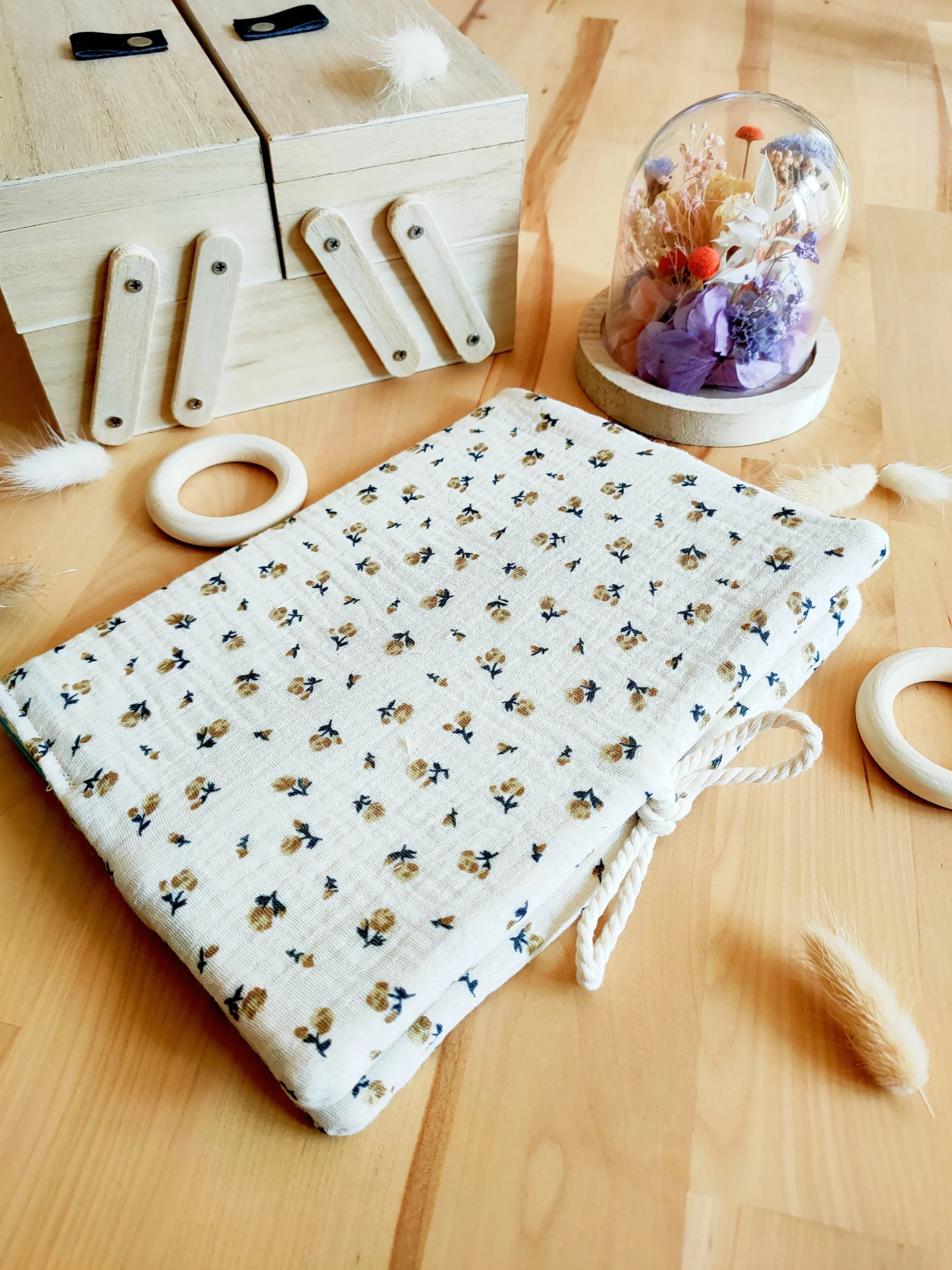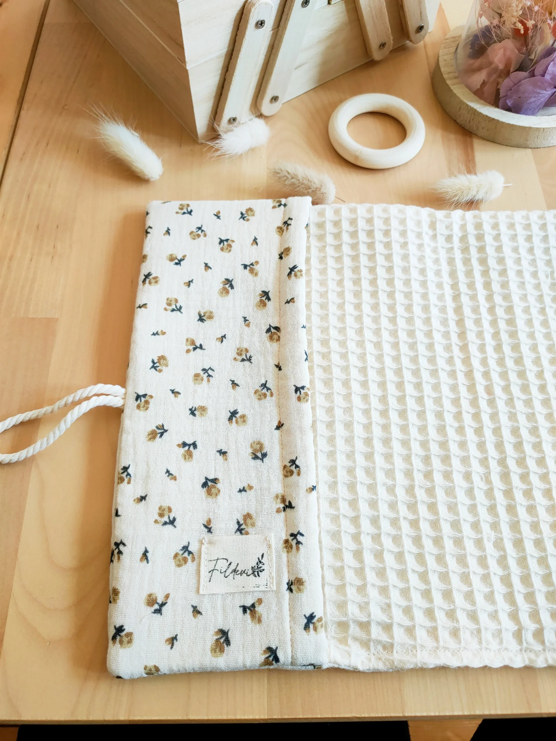 La texture douce du gaze de coton et le petit détail du cordon, en font un protège carnet de santé original !