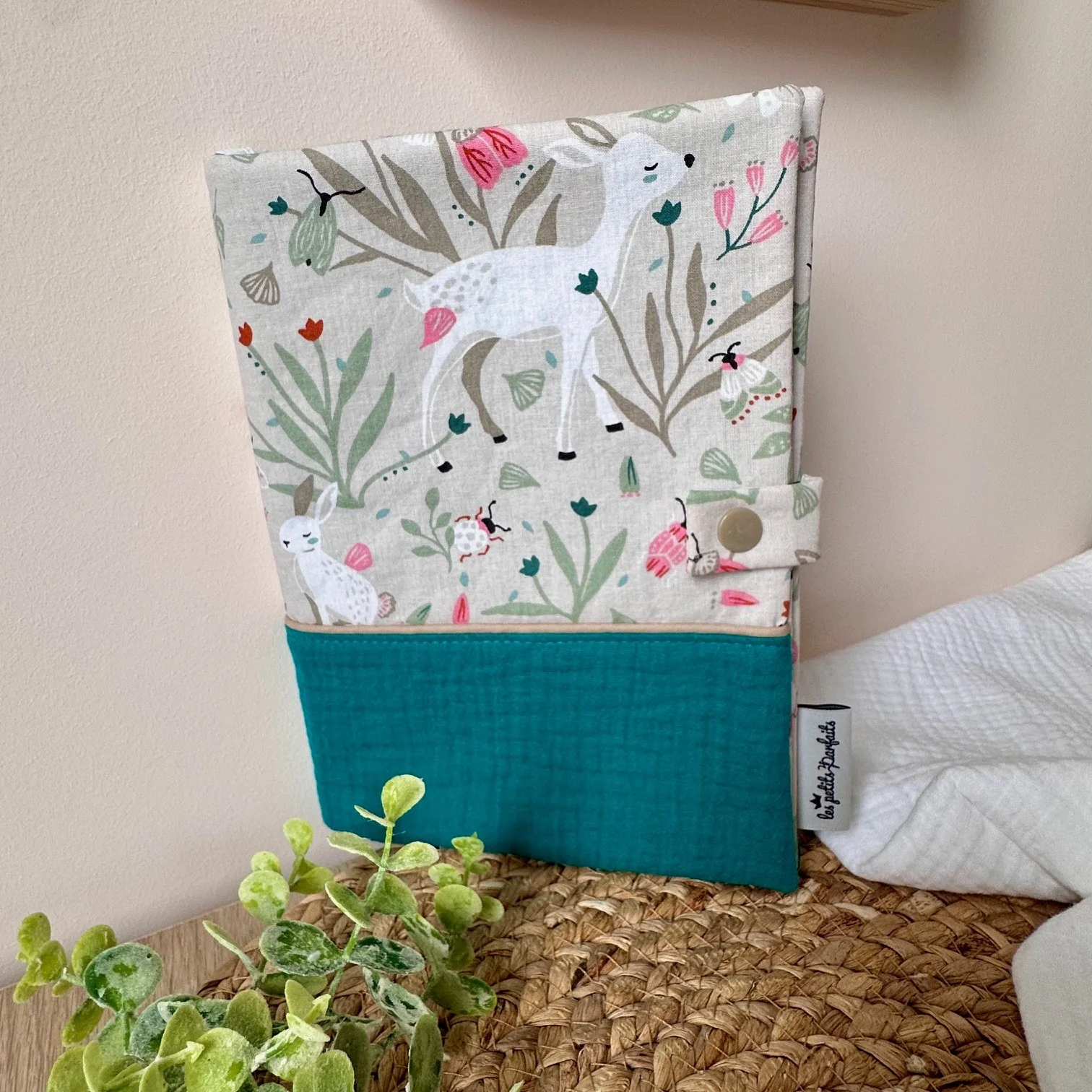 Découvrez ce charmant protège carnet de santé, mettant en vedette des adorables chevreaux sur fond gris, associés à une double gaze émeraude 🐐 La personnalisation (prénom, mot, date de naissance) sera effectuée avec un thermocollant textile du coloris de votre choix.