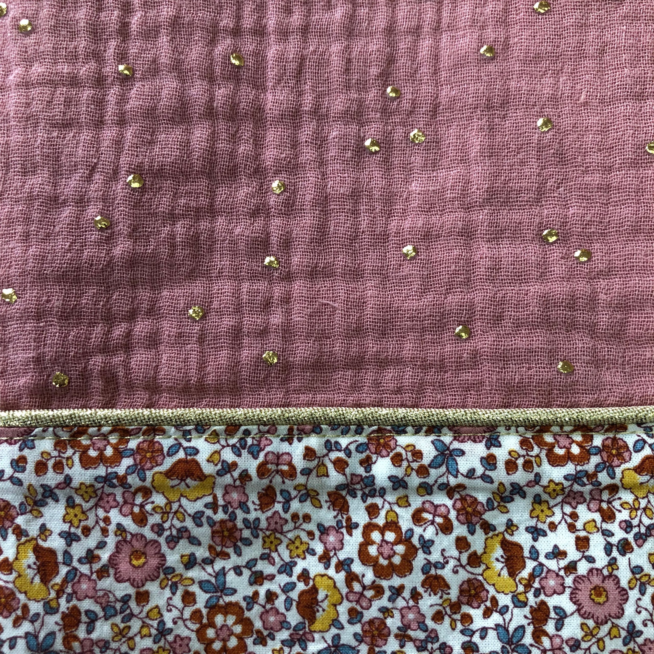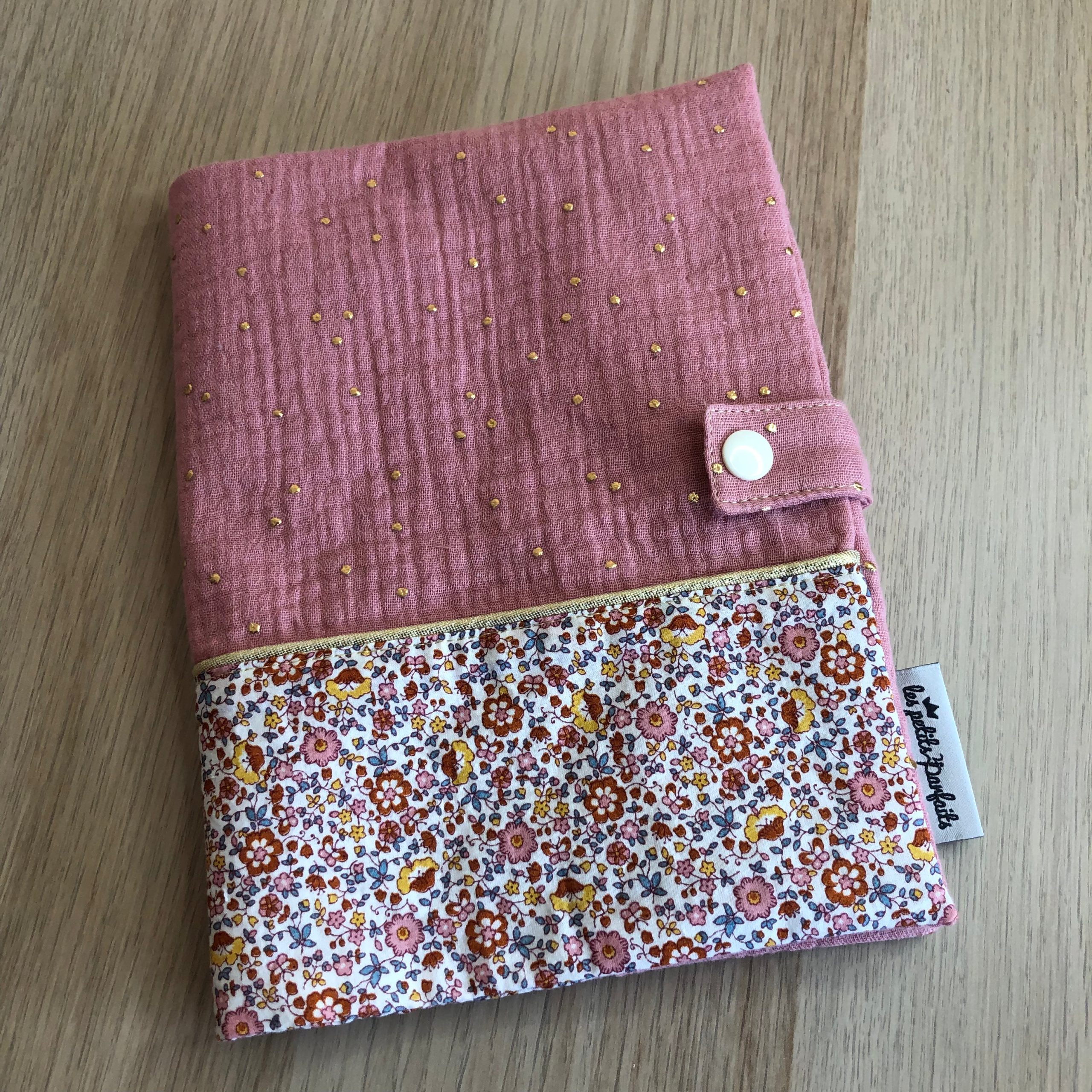 Protège carnet de santé bi-colore personnalisable avec fermeture pression : – double gaze de coton mini-pois dorés – batiste de coton petites fleurs roses – passepoil lurex or (liseré entre les deux tissus) La doublure est rigidifiée pour davantage de tenue. Il dispose d’un espace range-ordonnance et d’un marque page doré. Il n’attend plus qu’à […]