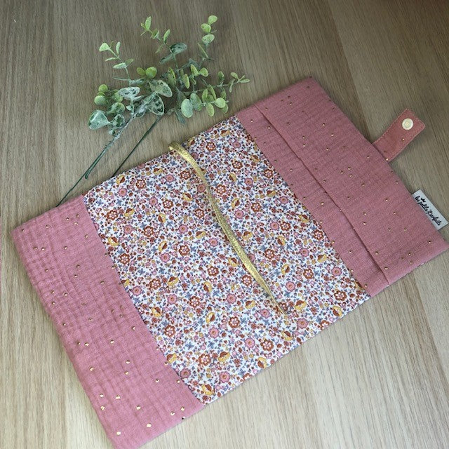 Protège carnet de santé Thème double gaze et petites fleurs roses (avec prénom)