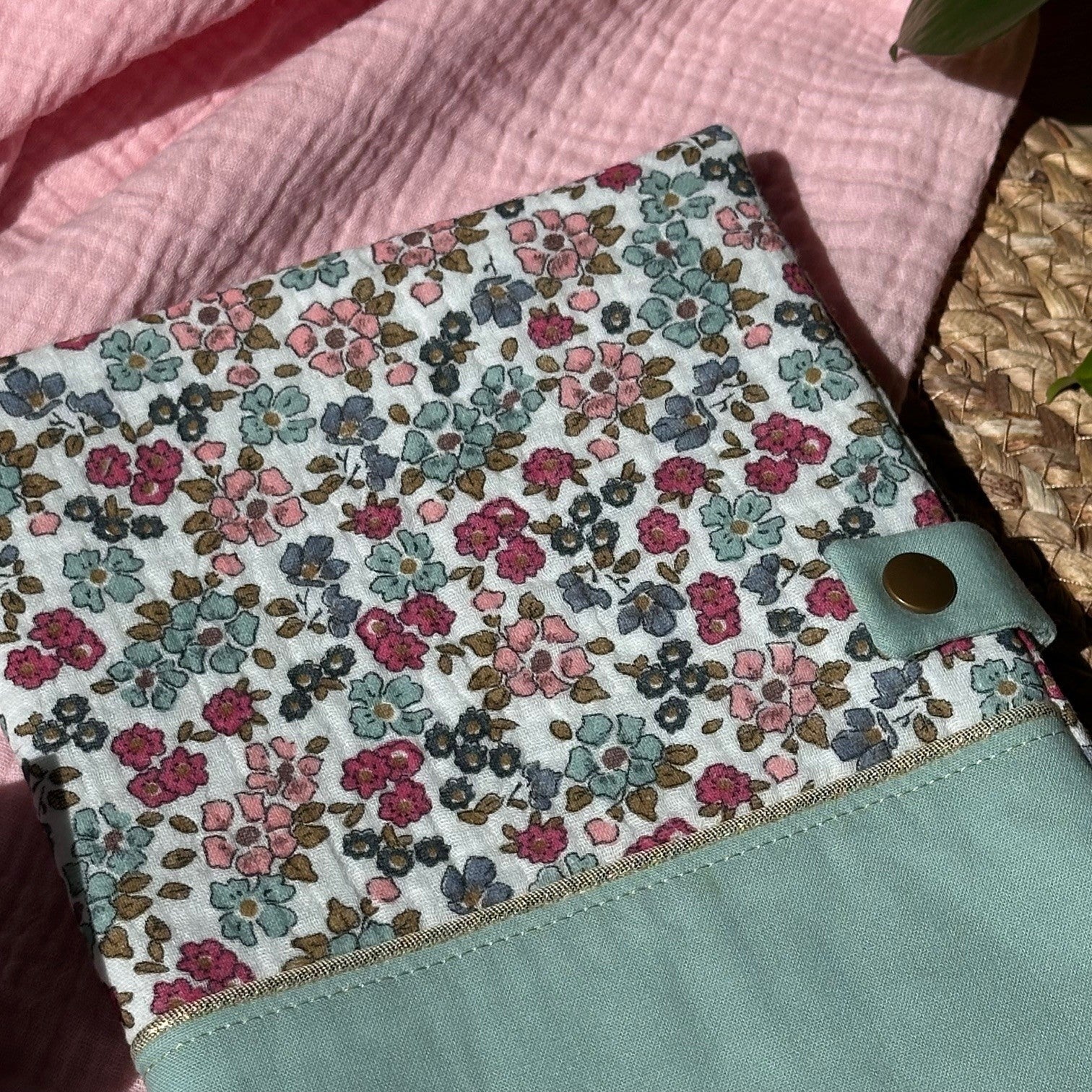 Découvrez ce charmant protège carnet de santé fleuri associé à un coton uni couleur menthe. Le passepoil doré entre les deux tissus ajoute une élégance supplémentaire à ce modèle. 🌸 La personnalisation (prénom, mot, date de naissance) sera effectuée avec un thermocollant textile du coloris de votre choix.