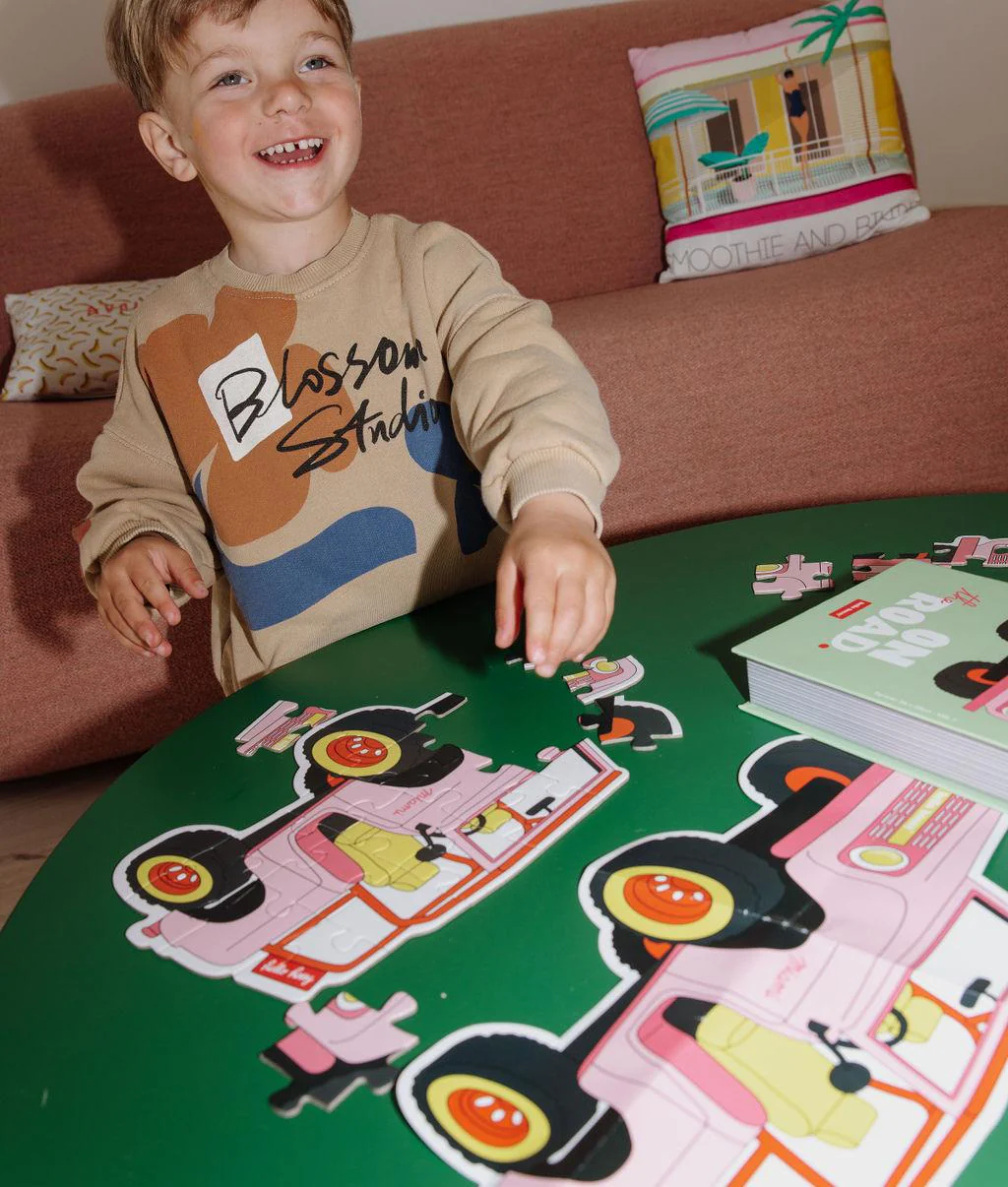 Découvrez le Puzzle pour enfants, On the Road, dès 3 ans. 24 pièces à assembler. Format original, illustration inédite, carton recyclé. Packaging effet livre, idéal pour la décoration de la chambre des kids. Super cadeau à offrir !