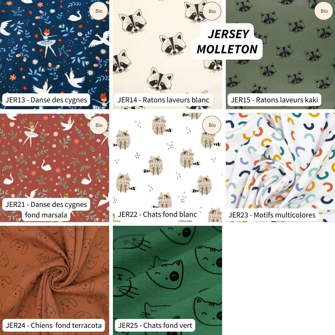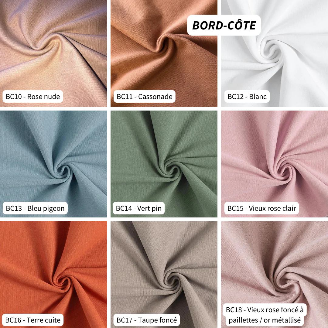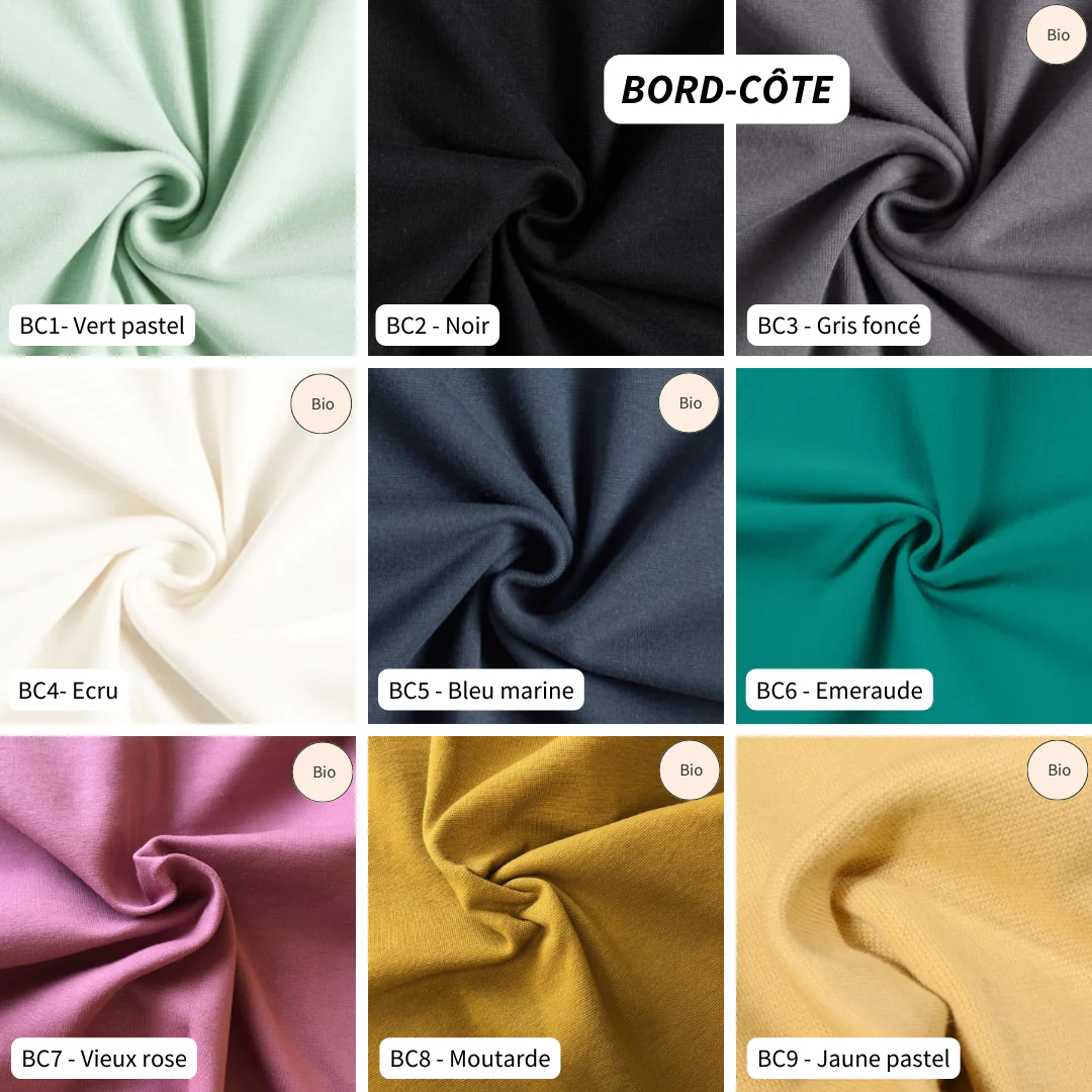 Vous choisissez la taille souhaitée, le tissu principal du pantalon dans la sélection proposée (jersey molleton) ainsi que le coloris du tissu bord-côte (utilisé pour la ceinture et les chevilles) puis je m’occupe de la confection ♡
