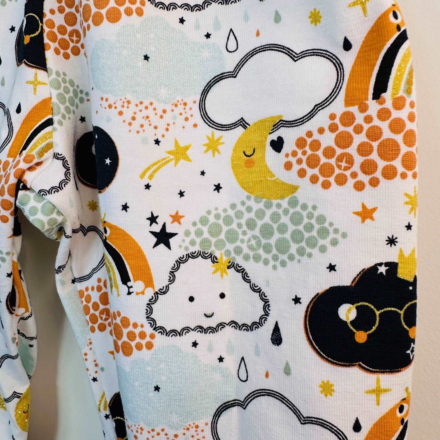 Offrez à votre bébé un vêtement alliant confort et praticité avec ce magnifique sarouel évolutif non genré. Avec ses motifs arc-en-ciel 🌈, nuages ☁️ et ses délicates touches dorées ✨, il s’intègre parfaitement à l’univers de bébé, tout en garantissant une liberté totale de mouvement.