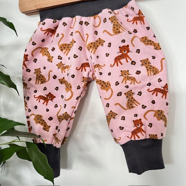 Pantalon sarouel motif panthères sur fond rose et bord-côte gris
